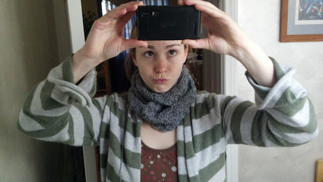 Stand in awe as I model the mighty cowl with a dorky expression.